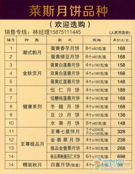 正文摘要:五星品質(zhì),五星享受 2014年萊斯大酒店月餅券員工價(jià)熱銷中 歡迎廣大朋友致電咨詢購(gòu)買 林小姐:15875111445(歡迎朋友加微信好友了解詳細(xì)信息) QQ:413778007(空間有相關(guān)價(jià)目表及品種介紹) |
